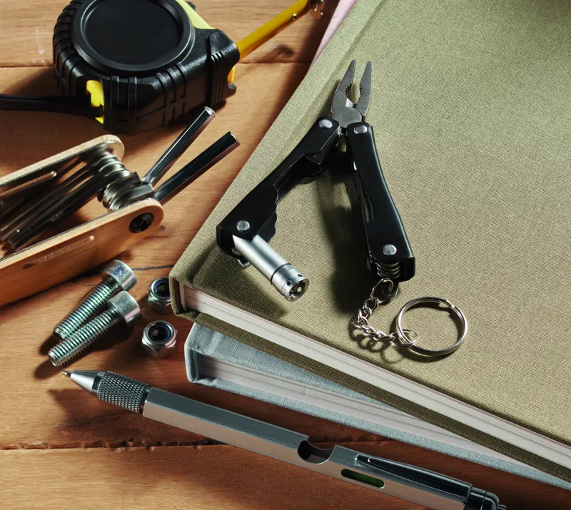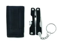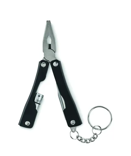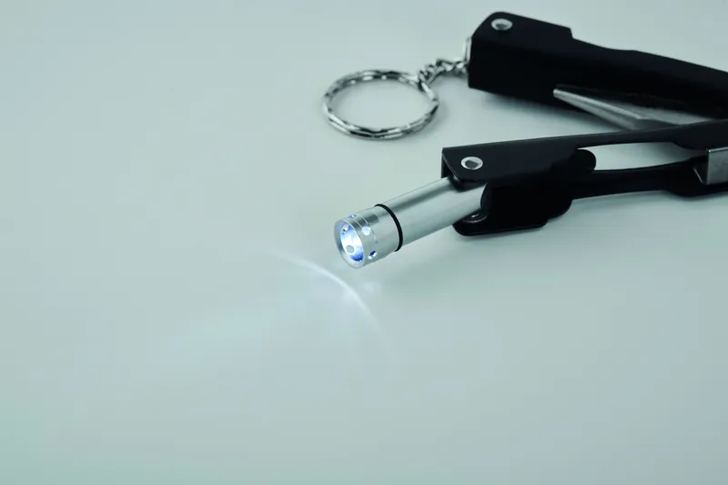 Összecsukható multifunkciós szerszám zseblámpával, rozsdamentes acélból. 10 szerszám funkcióval, 600D poliészter tokban. A működéshez szükséges 3 db AG3 gombelemmel szállítjuk.