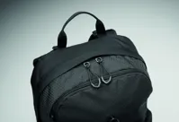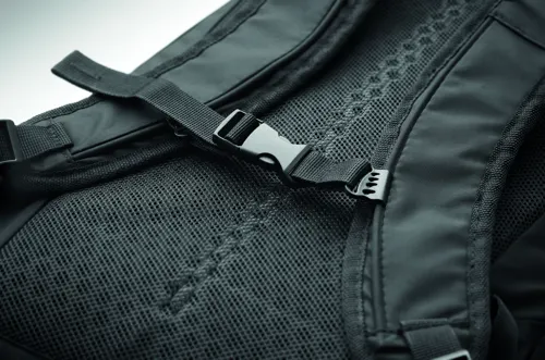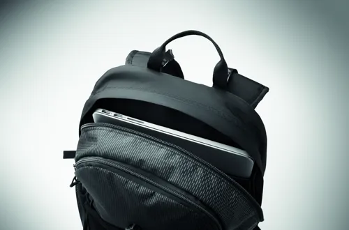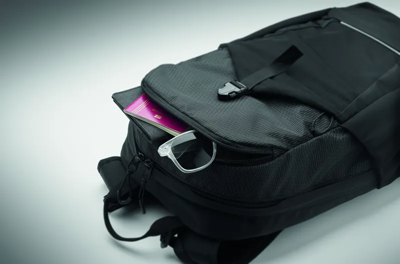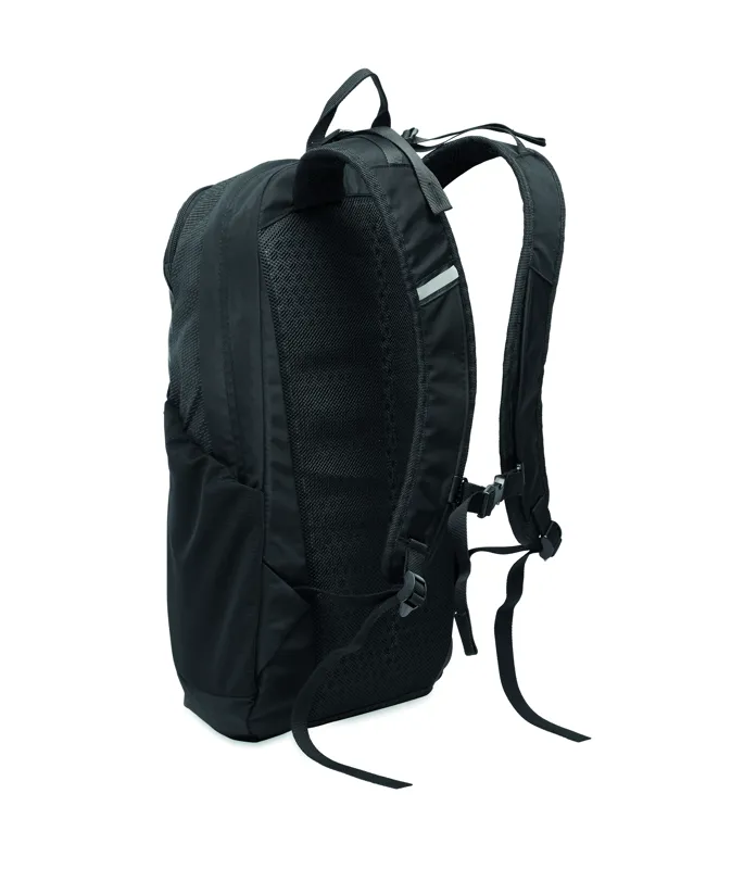 18 l-es túra hátizsák vízlepergető 420D nejlonból, fényvisszaverő csíkkal. Belső 15 colos laptop rekesszel. Egy cipzáras elülső rekesz és egy elülső nyitott zseb csattal. Két oldalsó nyitott zseb. Párnázott hát és vállpántok. Szellőző hátoldal.