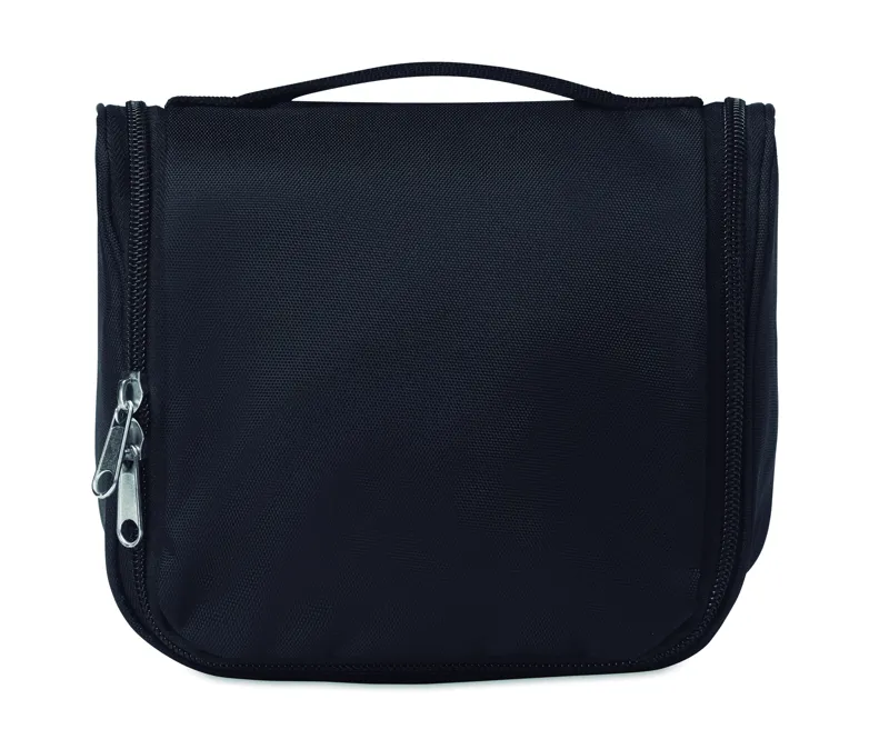 Felakasztható kozmetikai táska, poliészter anyagból. Rekeszekkel és hálós zsebbel. Tökéletes utazáshoz.