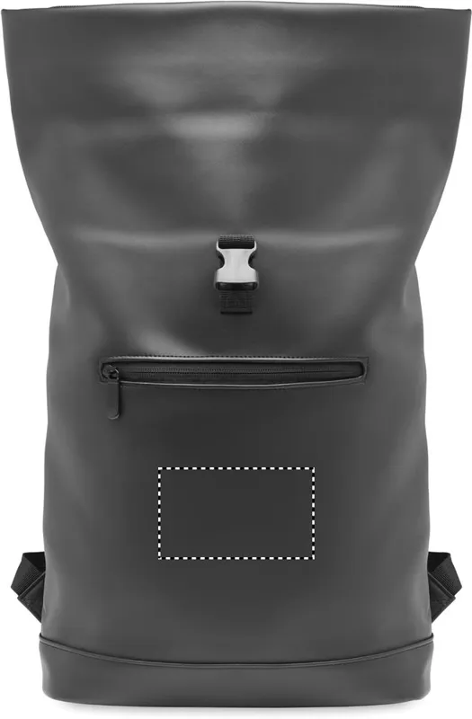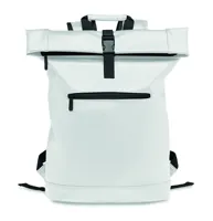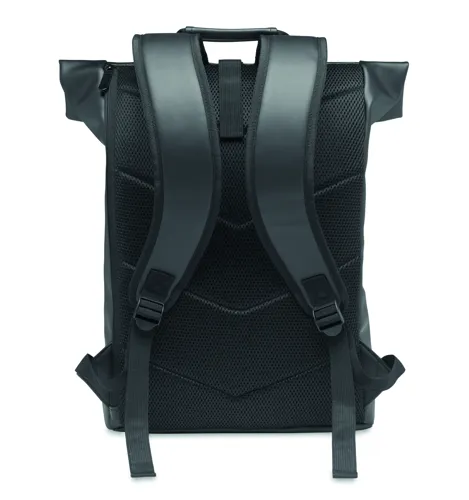 15 colos roll top csavart záródású laptop hátitáska puha PU anyagból, párnázott háttal és megerősített aljjal. Nagyméretű cipzáras első zseb. A bélés 210D RPET anyagból készült.