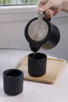Kiváló minőségű kerámia teáskészlet matt felülettel és bambusz tálalótálcával. Tartalmaz egy teáskannát (500 ml) rozsdamentes acél fedéllel és teaszűrővel, valamint két csészét (150 ml). Kraft papír dobozban.