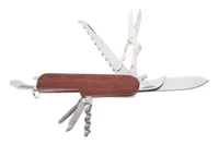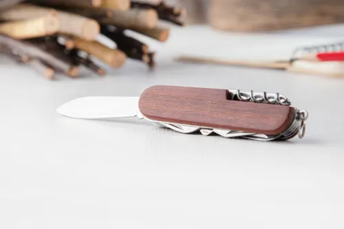 Rozsdamentes acél zsebkés fa nyéllel, 9 funkcióval.