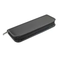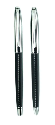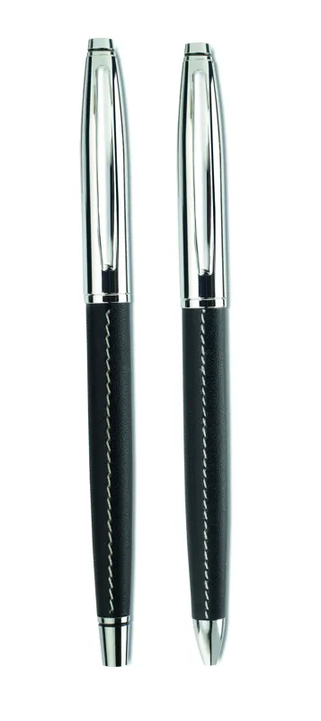 Golyóstoll és roller toll szett cipzáras PU bőr tokban, kontrasztos varrással. A golyóstoll kék, a roller feketén író betéttel.