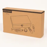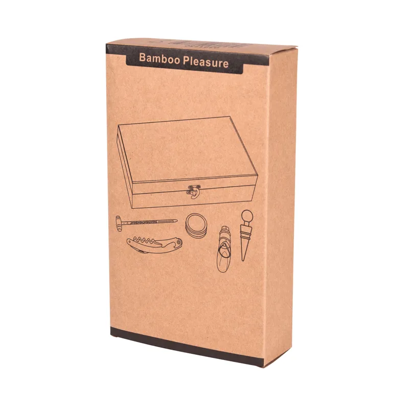 BAMBOO PLEASURE boros szett, bambusz dobozban: üvegből készült bor hőmérővel, rozsdamentes acélból készült borgyűrűvel, fém palackdugóval, fém kiöntő csőrrel és rozsdamentes acél pincérbicskával