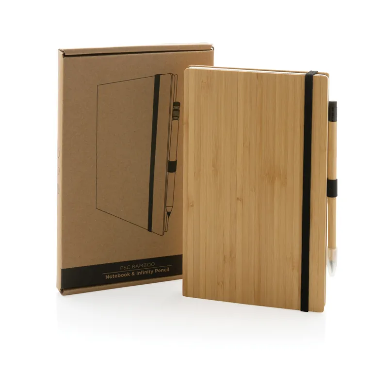 Stílusos FSC® bambusz jegyzetfüzet fenntartható bambuszból, 80 lap/160, 70 gsm oldal újrahasznosított papírból. A készlet egy infinity ceruzát is tartalmaz, amely körülbelül 100 ceruzát is túlél! A szöveg írásának hosszúsága akár kb. 20 000 méter. Grafithegy segítségével készít grafitvonalat. Nem csak úgy ír mint egy ceruza, ugyanúgy radírozható is. FSC® bambuszból, FSC® kraft ajándékdobozban.