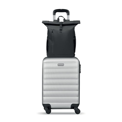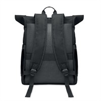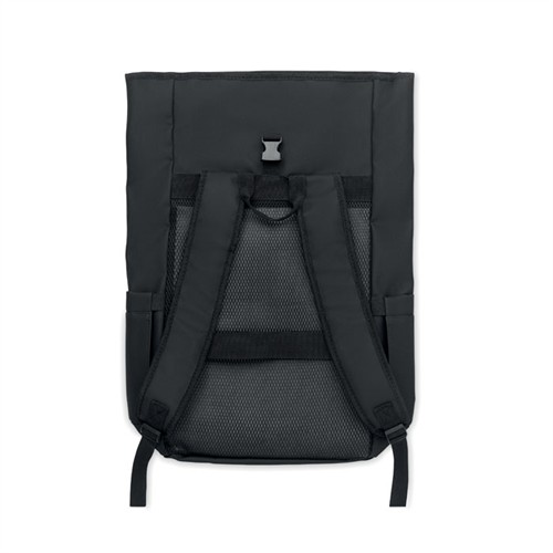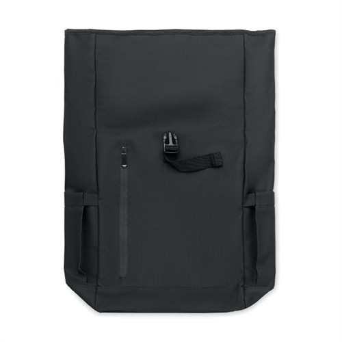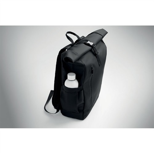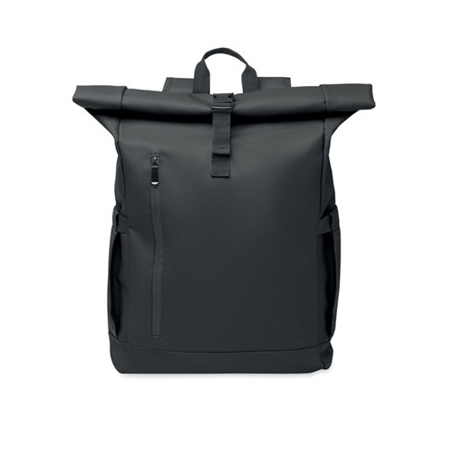 Rolltop csavart záródású, 15 colos laptop hátizsák PU bevonatú 600D RPET poliészterből, RPET poliészter béléssel. Hálós, párnázott hátrész cipzáras zsebbel és gurulós bőröndre illeszkedő pánttal. Párnázott vállpánt hálós belső felülettel.