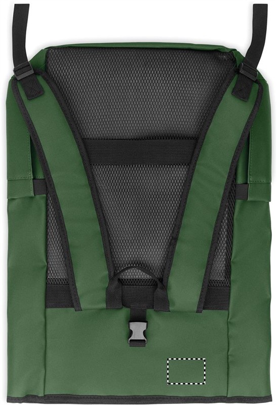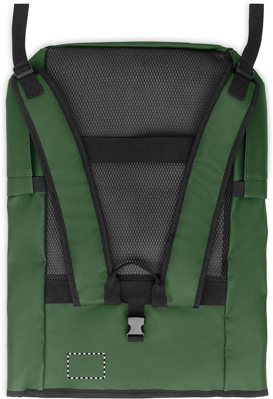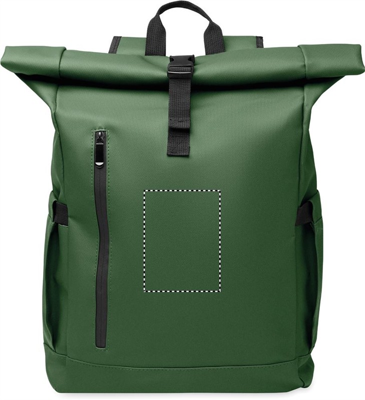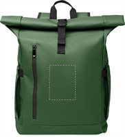 Rolltop csavart záródású, 15 colos laptop hátizsák PU bevonatú 600D RPET poliészterből, RPET poliészter béléssel. Hálós, párnázott hátrész cipzáras zsebbel és gurulós bőröndre illeszkedő pánttal. Párnázott vállpánt hálós belső felülettel.
