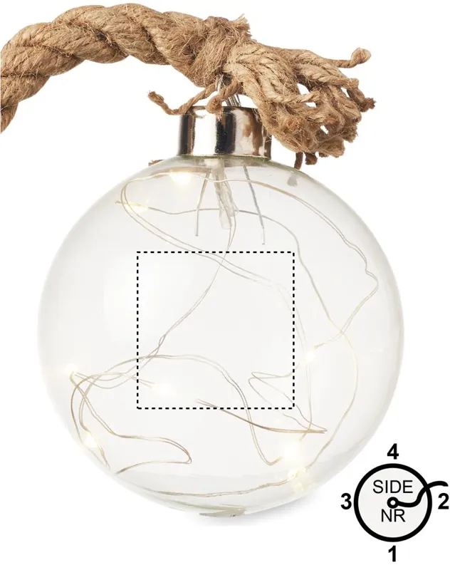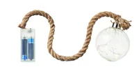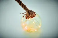 Üveggömb (Ø 8 cm) 8 LED-es, meleg sárga fényfüzérrel és juta zsinórral. 2 db AA elemmel működik, elem nélkül szállítjuk.