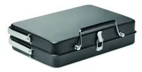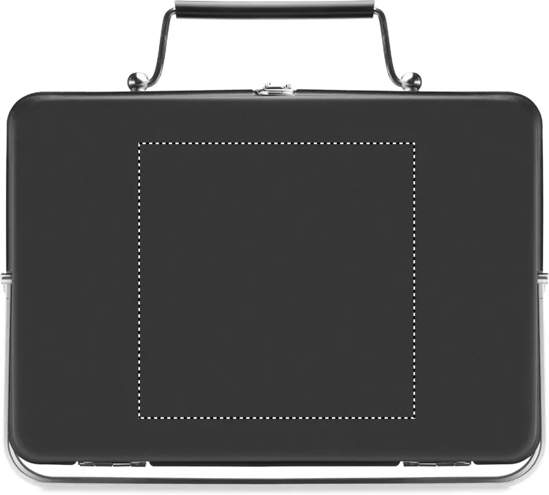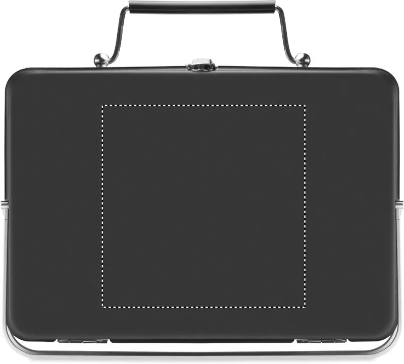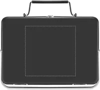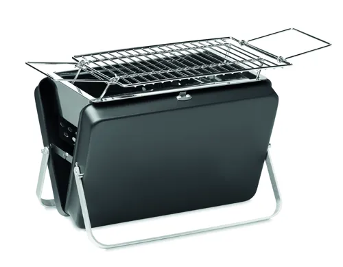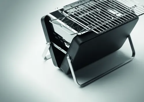 Rozsdamentes acélból készült hordozható, táska formába összecsukható minigrill grillráccsal, az alján állvánnyal.