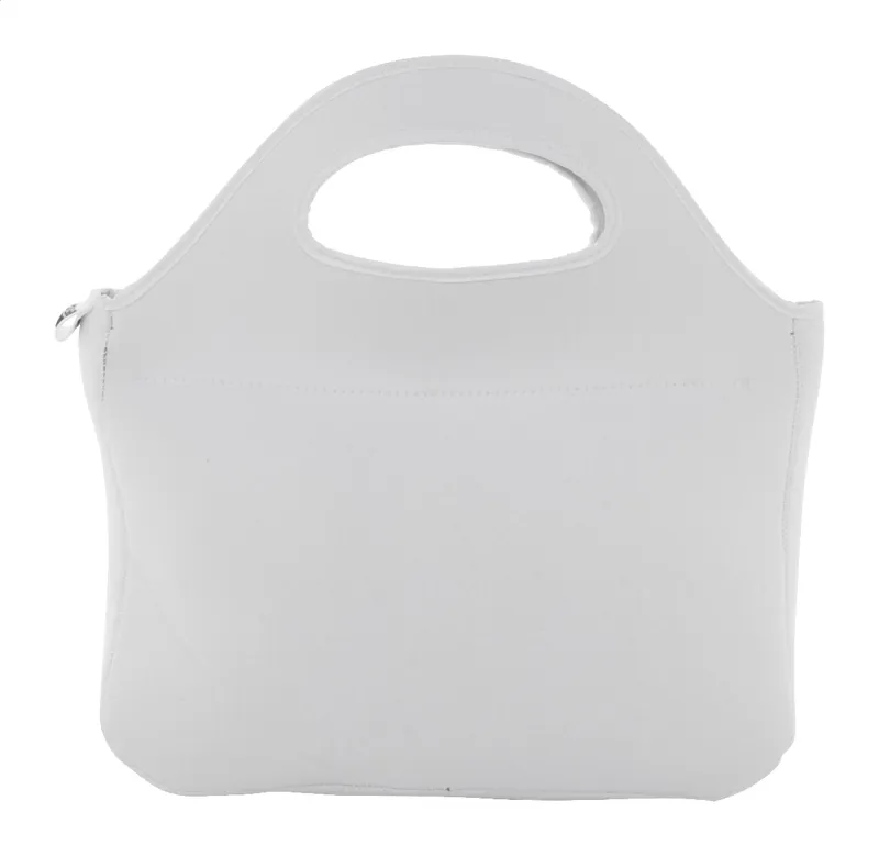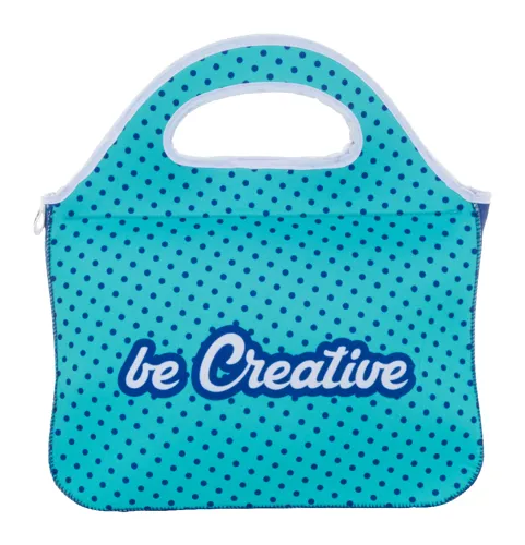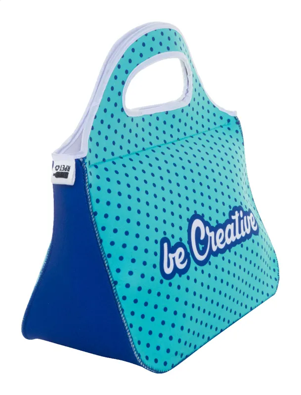 Egyedi gyártású, RPET neoprén ebédtáska cipzáras rekesszel és fogantyúkkal. Teljes felületén szublimációs nyomtatott grafikával és megkülönböztető RPET címkével. Minimális rendelési mennyiség: 25 db.