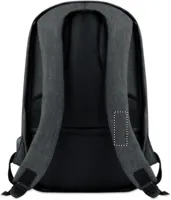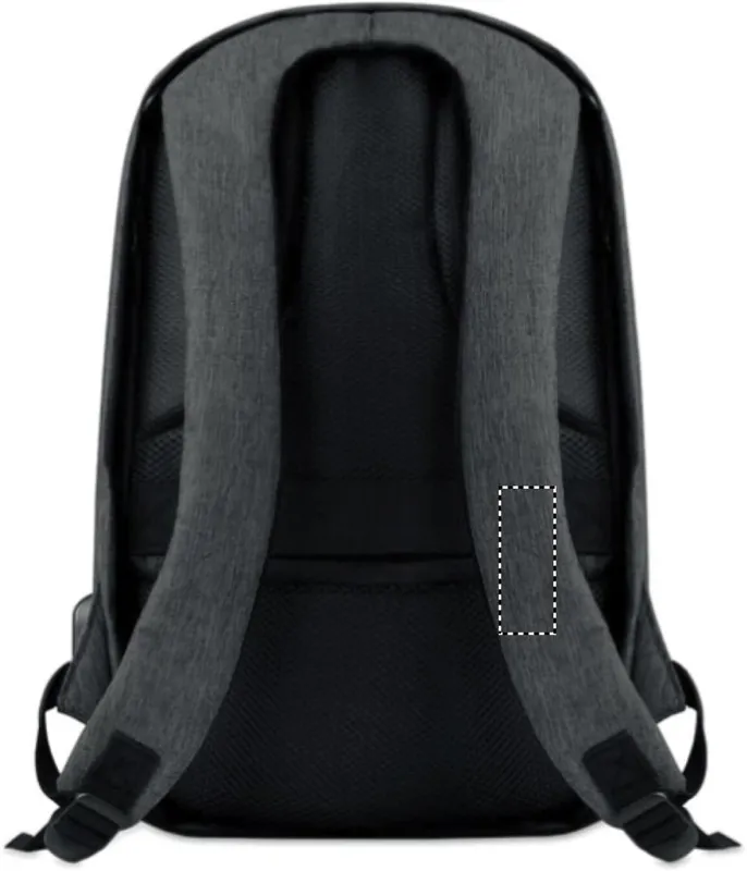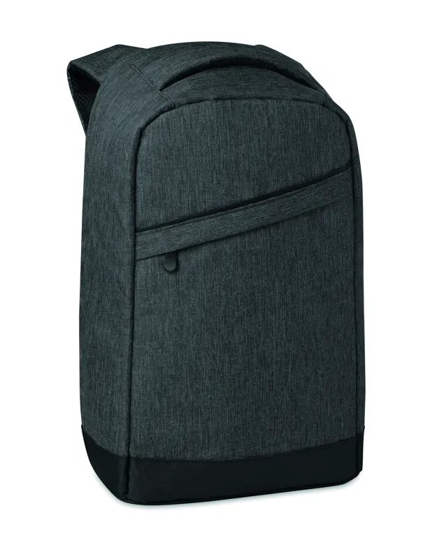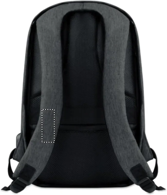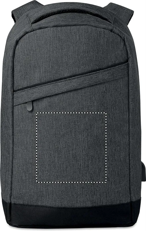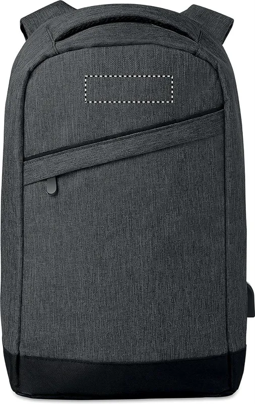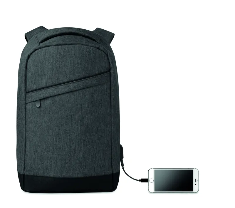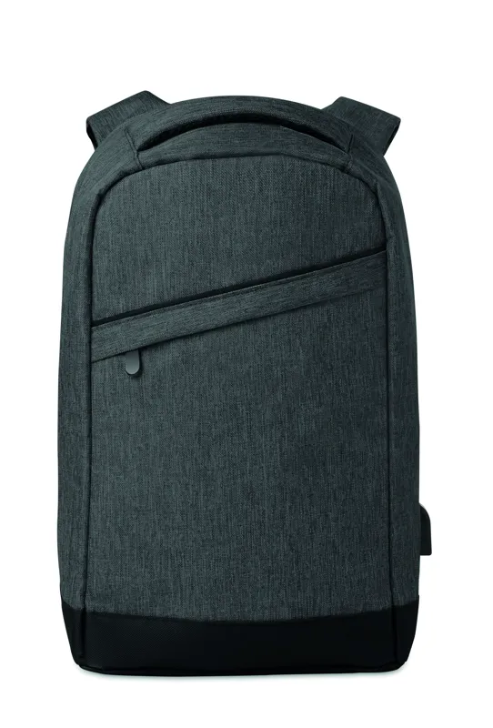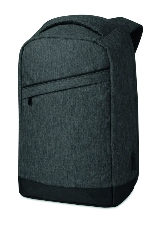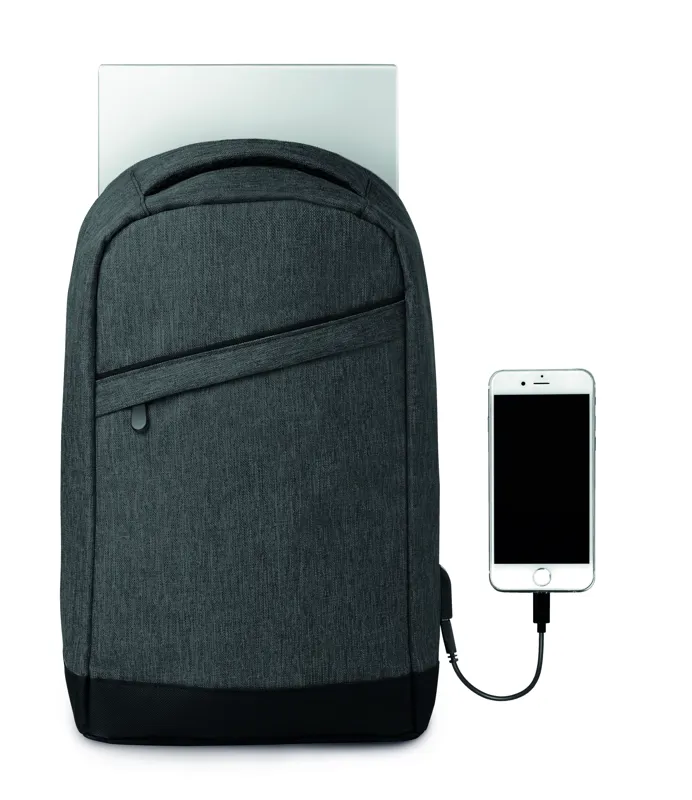 Melírozott színű 600D poliészter hátitáska. Párnázott vállpántok, 1 fő rekesz cipzárral. 13 colos laptoptartó rekesz és egy USB töltőkábel.