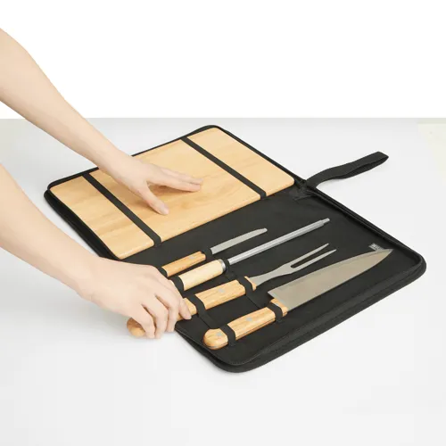 BEST BBQ szeletelő kés szett, 5 részes: tartalmaz rozsdamentes acél élezőt, szeletelő kést, húsvillát, és steak kést, valamennyi fa nyéllel, fa vágódeszkával, a szélén praktikus folyadékelvezető csatornával