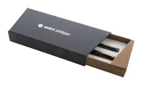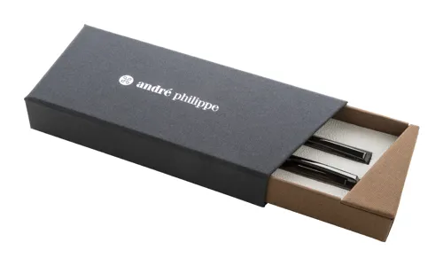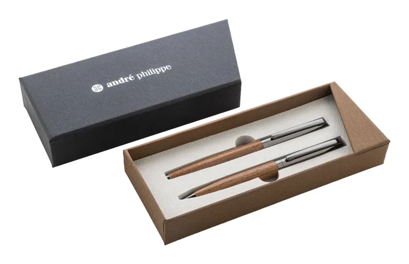 Elegáns, fém golyóstoll és rollertoll szett fa testtel és fényes fegyverfém részletekkel. Kéttónusú ajándékdobozban, kék tollbetéttel. André Philippe márkatermék.