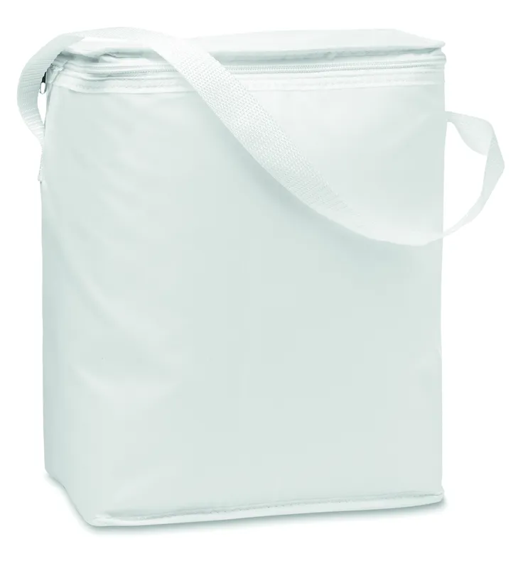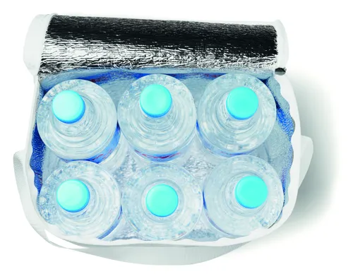 210D poliészter hűtőtáska 6 db 1,5 literes üveghez. 80 g vastag anyag. Nemszőtt fehér szegélyekkel. Szigetelő anyag: alumínium fólia. Űrtartalom 12,5 l.