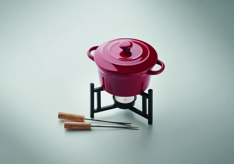 Kis fedeles kerámia fondü készlet két személyre. Két fanyelű fém villát tartalmaz. Teamécses nélkül szállítjuk. Űrtartalom: 300 ml.
