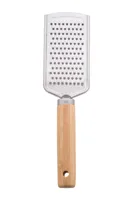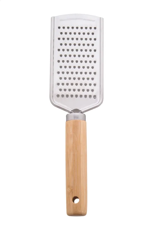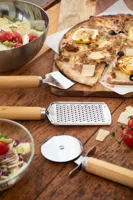 3 db-os, rozsdamentes acél pizza tálaló szett, bambusz fogantyúval, pamut tasakban. Egy sajtreszelőt, pizzavágót és spatulát tartalmaz.