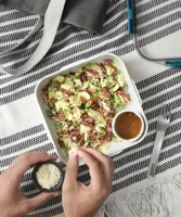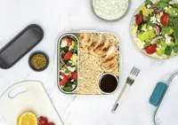 A Black+Blum legelső uzsonnás doboz dizájnja ihlette. A kerámia tálhoz hasonlóan kialakított, eredeti uzsonnás doboz tartalmaz egy belső dobozt valamint egy szivárgásmentes szószos dobozt aminek fedelén díszítőfelület található, valamint egy rozsdamentes acél villát. Mikrohullámú sütőben használható és mosogatógépben mosható, kivéve a tritán fedelet.