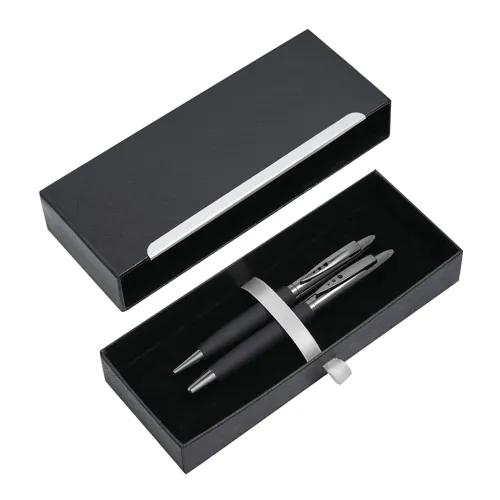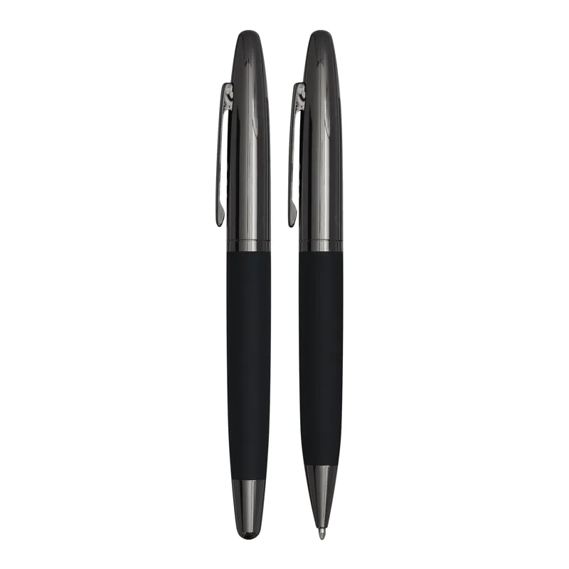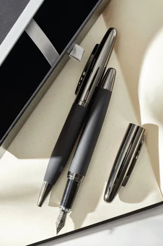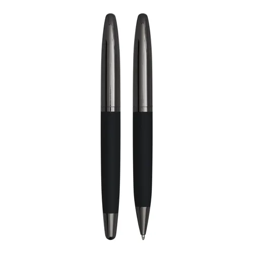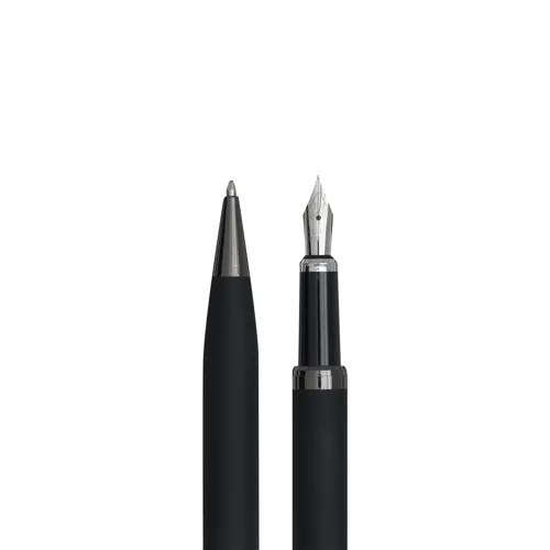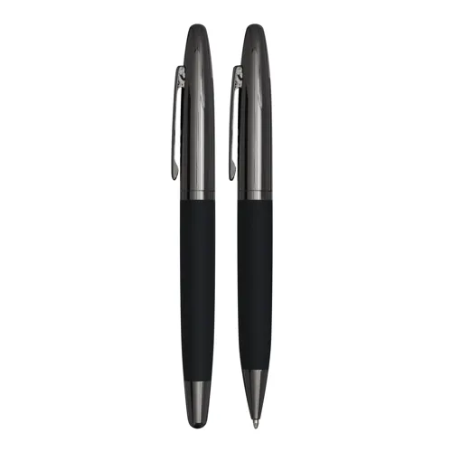 BLACK ELEGANCE toll szett: tekerő mechanikás golyóstollal, fém (fekete tintás) tollbetéttel, és töltőtoll tintapatronnal (kék tinta), gun-metal megjelenés, gumiborítású fogórésszel, fekete díszdoboz kiemelő szalaggal, dekoratív alumínium éllel