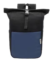 Újrahasznosított vászonból készült rolltop hátizsák csattal és cipzáras elülső zsebbel, puha, újrahasznosított PU bőrből. Párnázott laptop rekesszel (15"), oldalsó zsebekkel, párnázott hátrésszel és vállpántokkal. 70% újrahasznosított pamut és 30% RPET poliészter. Megkülönböztető újrahasznosított pamut címkével.