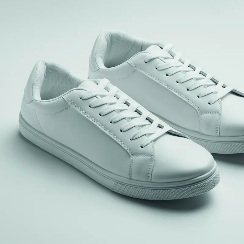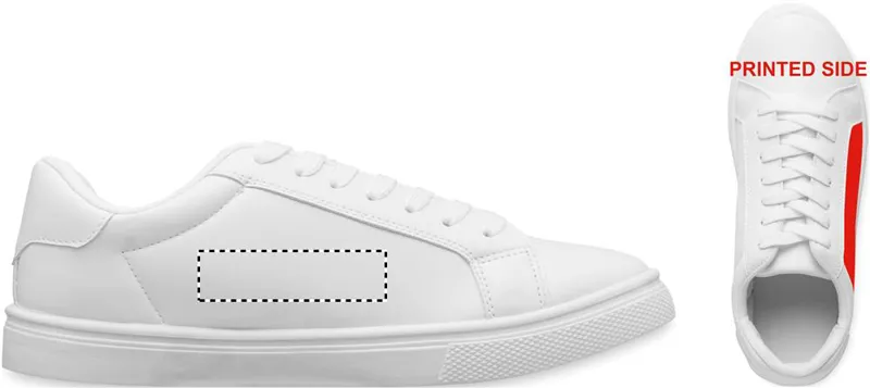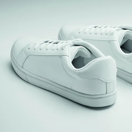 Könnyű PU tornacipő gumi talppal és poliészter fűzővel. Méret: 42. Fehér cipősdobozban.