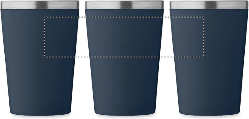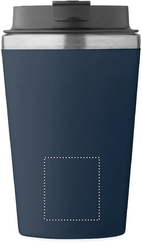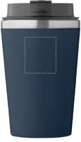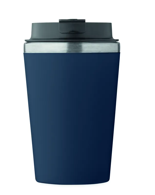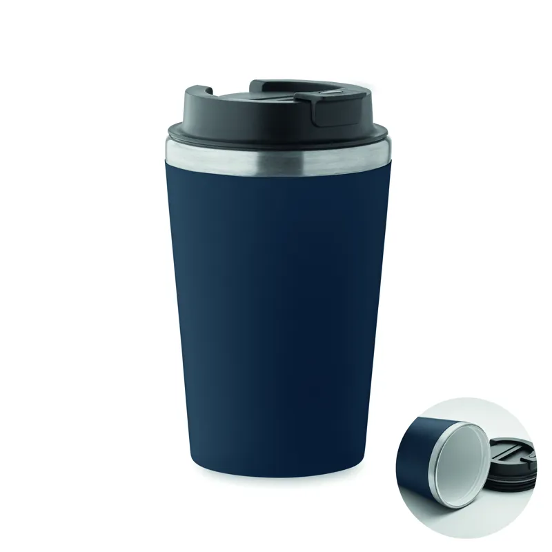 Duplafalú pohár, kívül PP, belül újrahasznosított rozsdamentes acél (90% újrahasznosított rozsdamentes acél és 10% rozsdamentes acél), kerámia belső bevonattal. Szivárgásmentes. Űrtartalom: 350 ml.