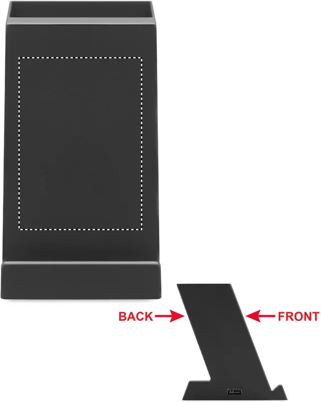 15W-os duplatekercses vezeték nélküli töltő tolltartóval ABS műanyagból. Teljesítmény: DC 9V/1.67A (15W) a gyors töltéshez. 1 USB-A portos áramkimenet.