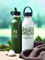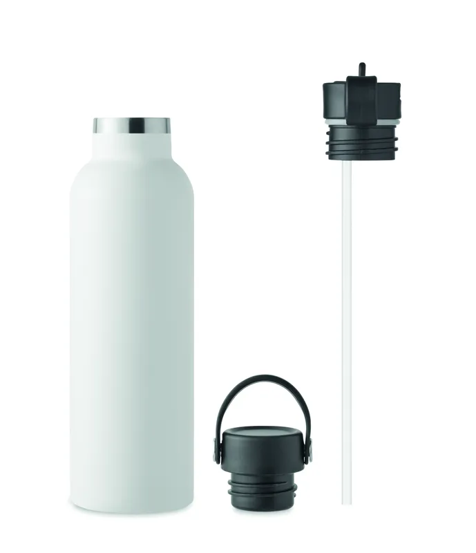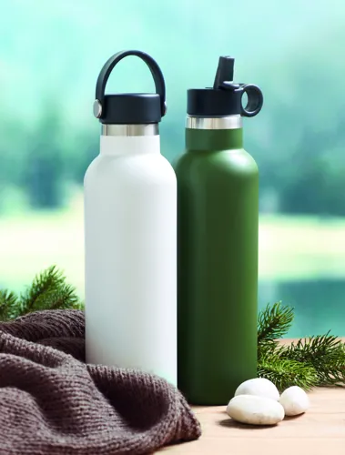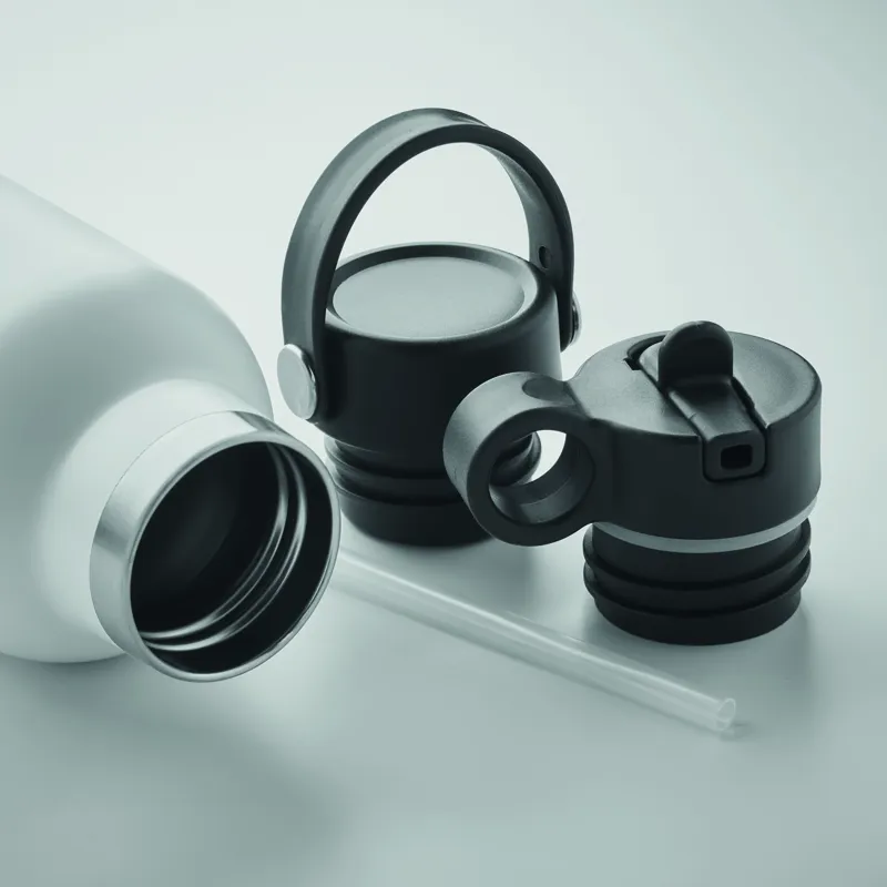 Duplafalú, újrahasznosított rozsdamentes acél (90% újrahasznosított rozsdamentes acél, 10% rozsdamentes acél) termoszpalack szivárgásmentes csavaros kupakkal és további cserélhető beépített szívószálas kupakkal. Űrtartalom: 700 ml.