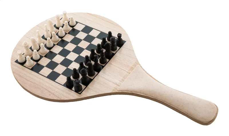 Strandtenisz 2 ütővel és egy labdával, fából és ökológiai búzaszalma műanyagból. 3 társasjátékot tartalmaz, melyeket az ütőkön lehet játszani. Pamut zsinóros tokban.