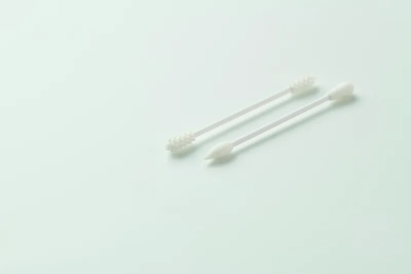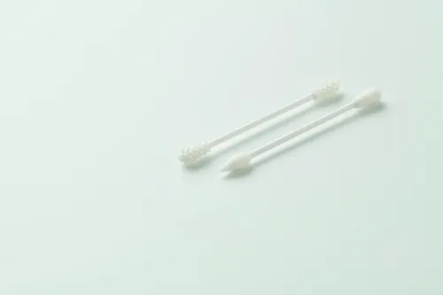 2 darab újrafelhasználható és mosható szilikon fültisztító pálcika 3 különböző fejjel. Húzózsinóros pamut tasakban.