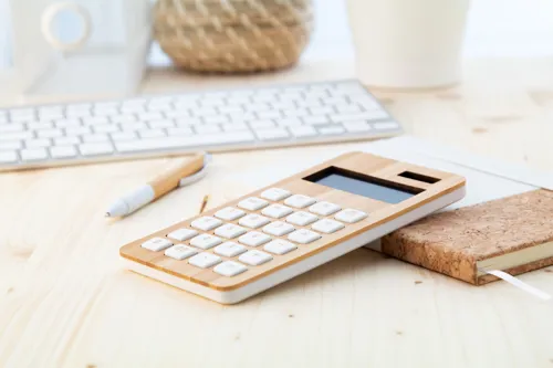 12 számjegyes napelemes számológép bambusz és műanyag borítással. Gombelemmel együtt szállítjuk.