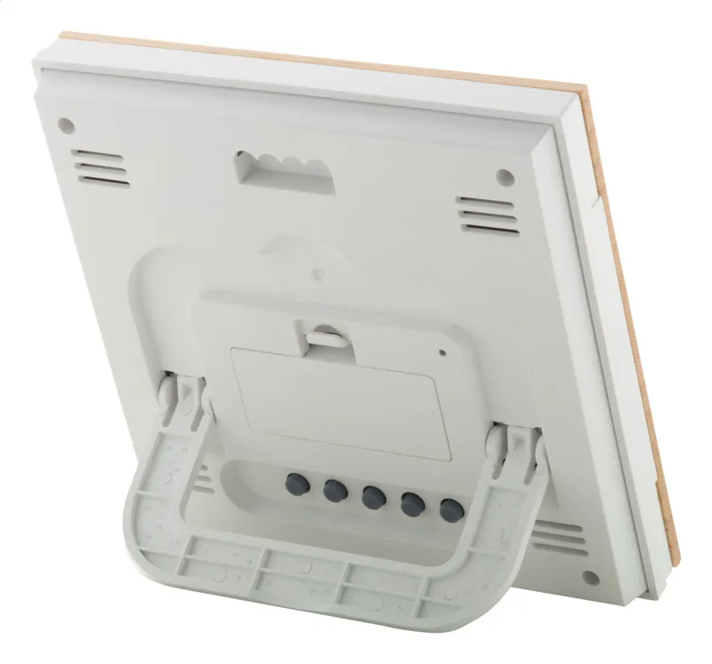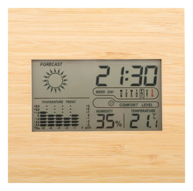 Digitális óra és időjárás-állomás bambusz előlappal. Funkciók: óra, naptár, hőmérő, páratartalom-mérő és hőmérsékletváltozás-memória. Elem nélkül szállítjuk. 2 db AAA elemmel működik.
