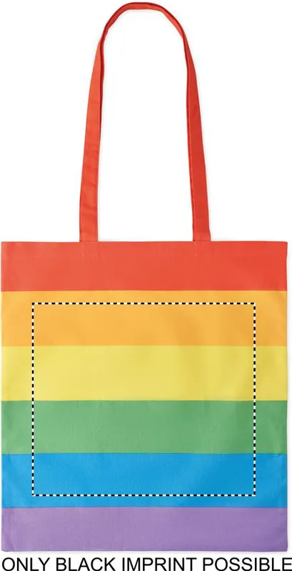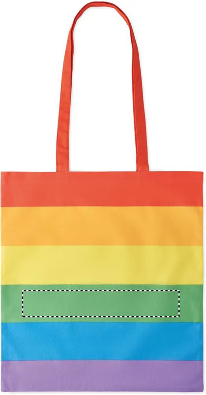 200 g vastag szivárványszínű pamut bevásárlótáska hosszú füllel. Adjon egy kis színt márkájának vagy különleges üzenetének ezzel a vidám bevásárlótáskával. Ez a táska ideális a napi bevásárláshoz. A hosszú füleknél fogva hordozhatja, vagy a vállára akaszthatja, hogy a keze szabadon maradjon. Teherbírás 2,5 kg.