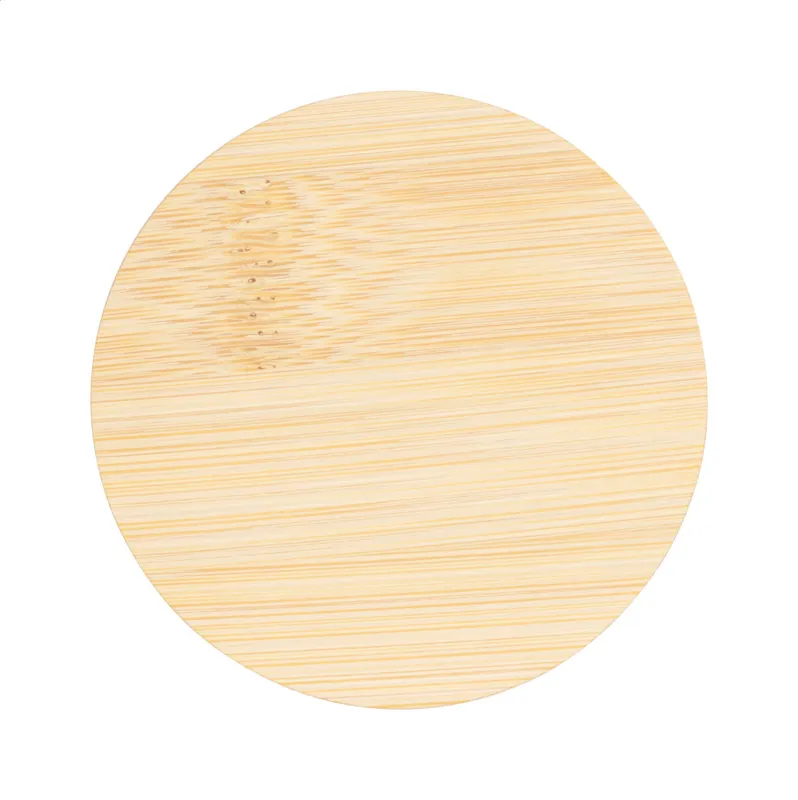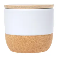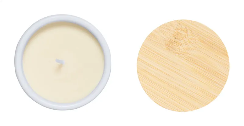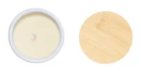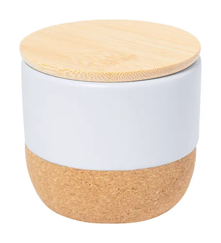 Vanília illatú, növényi alapú viaszgyertya kerámia tartóban, természetes parafa talppal és bambusz tetővel.