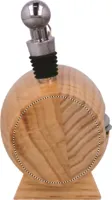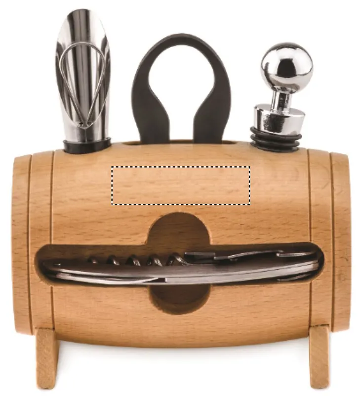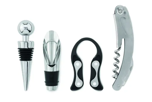 4 részes boroskészlet fa állványon. Tartalmaz egy pincérkést, palack visszazárót, kiöntőt és fóliavágót.
