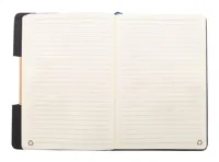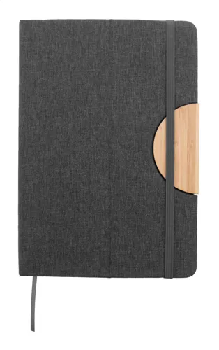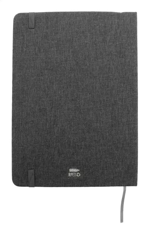 RPET poliészter borítású spirál jegyzetfüzet bambusz betéttel és telefon-tartó funkcióval. 80 újrahasznosított papírból készült vonalas lappal, gumis pánttal és könyvjelzővel. A5 méretű.