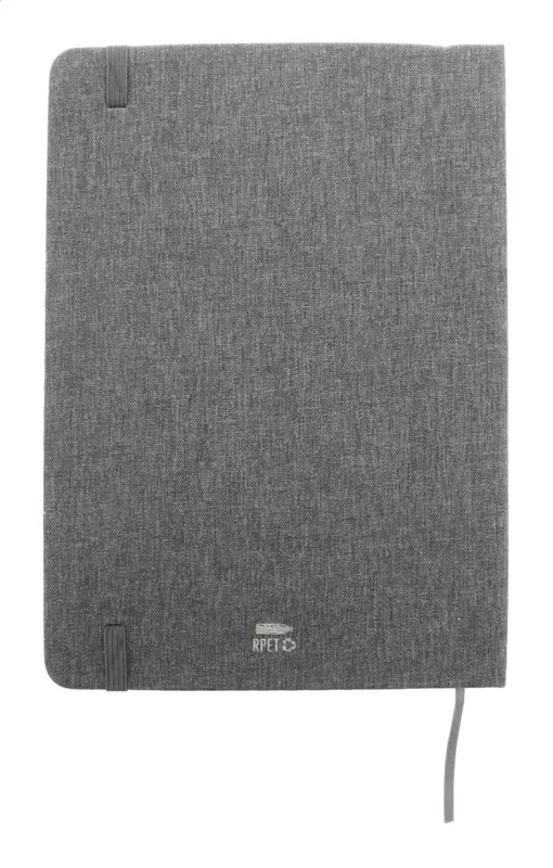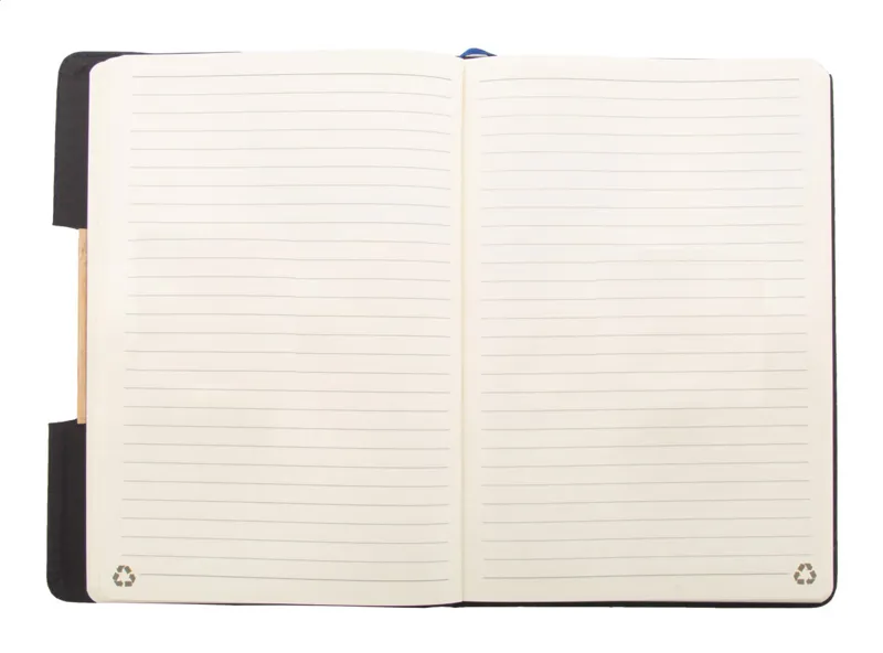 RPET poliészter borítású spirál jegyzetfüzet bambusz betéttel és telefon-tartó funkcióval. 80 újrahasznosított papírból készült vonalas lappal, gumis pánttal és könyvjelzővel. A5 méretű.