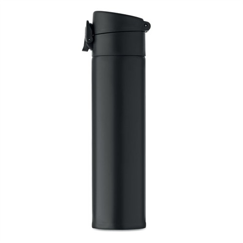 Duplafalú palack újrahasznosított rozsdamentes acélból (90% újrahasznosított rozsdamentes acél és 10% rozsdamentes acél), biztonsági zárral a fedélen és nyomógombos nyitási opcióval. Szivárgásmentes. Űrtartalom: 300 ml.