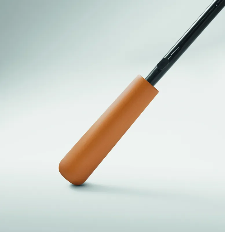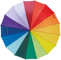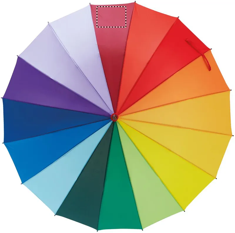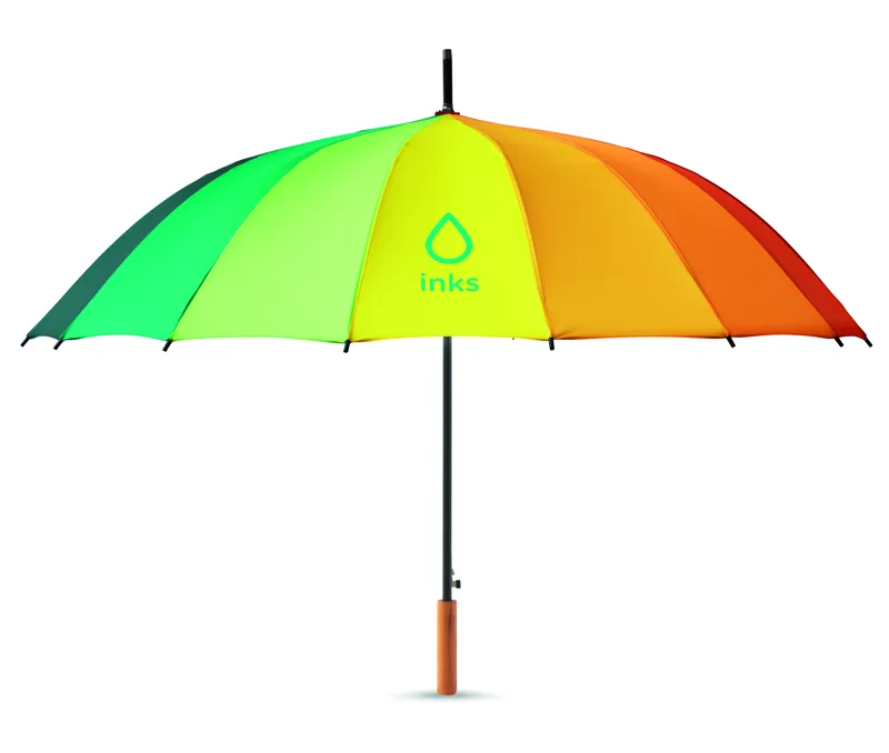 27 colos szivárványszínű, automatikus nyitású esernyő 190T nyersselyem anyagból, fa rúddal, üvegszálas bordákkal, fekete bevonatú fém cikkelyzáró elemekkel és csúccsal. 16 panelek.