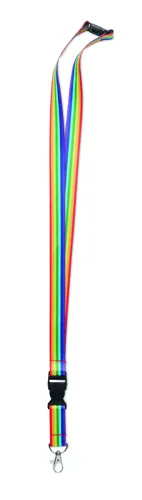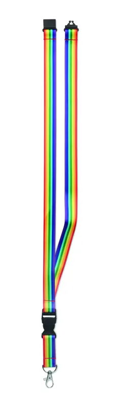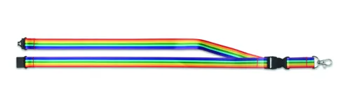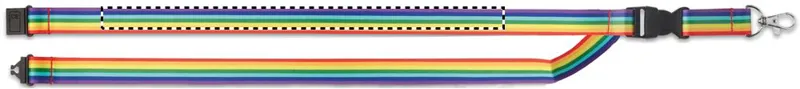 Szivárványszínű RPET nyakpánt fém kapoccsal, levehető csattal és biztonsági oldózárral.