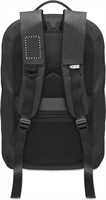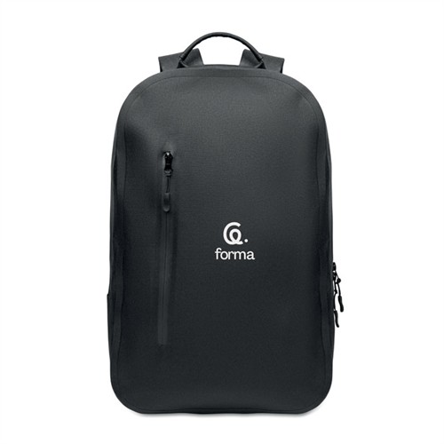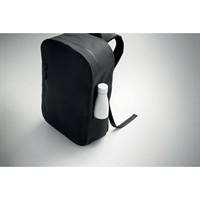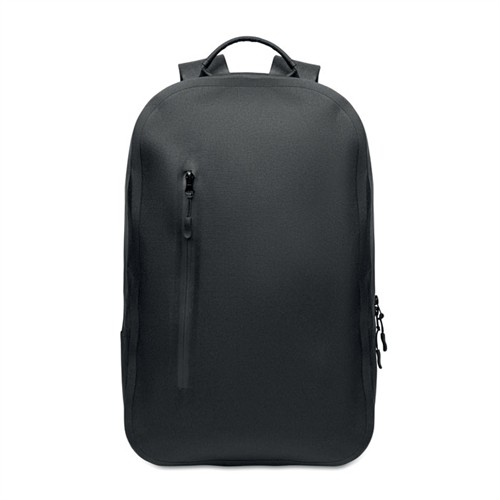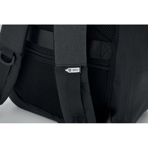 16 colos laptop hátizsák 300D RPET poliészterből, 210D poliészter béléssel. Vízlepergető anyag. Rejtett cipzáras zseb és gurulós bőröndre illeszkedő pánt a hátoldalon. Párnázott belső laptop rekesz, hálós hátoldal és vállpánt.