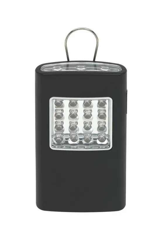 BRIGHT HELPER LED elemlámpa: 16 db fehér LED égővel, műanyag házban, két rögzítési lehetőséggel: kihajtható akasztó és mágnes a hátoldalán, oldalsó ki/ be kapcsoló gombbal, ajándékdobozban
