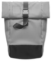 Roll top csavart záródású 15 colos laptop hátizsák magas fényvisszaverő képességű 190T poliészterből. Párnázott hát, alj, vállpántok, elülső cipzáras zseb. Alsó rész 600D újrahasznosított poliészterből.