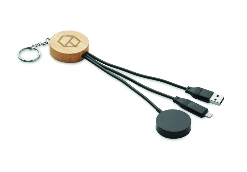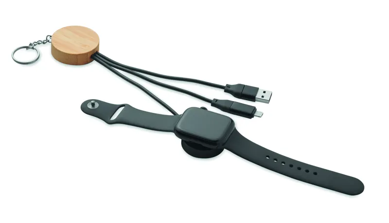 Kulcstartó 4 az 1-ben, 60W töltő- és adatátviteli kábellel, bambusz részletekkel. Bemenet: 2 az 1-ben C-típusú és USB-A. Kimenet: okosóra töltés (Samsung® és Apple®) , C-típusú és mikro-B (2 az 1-ben).