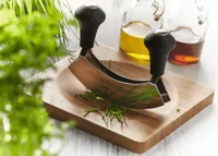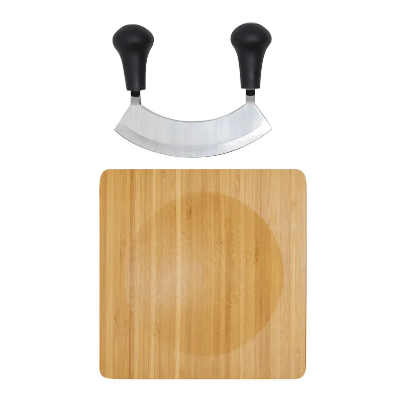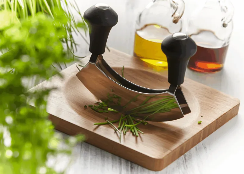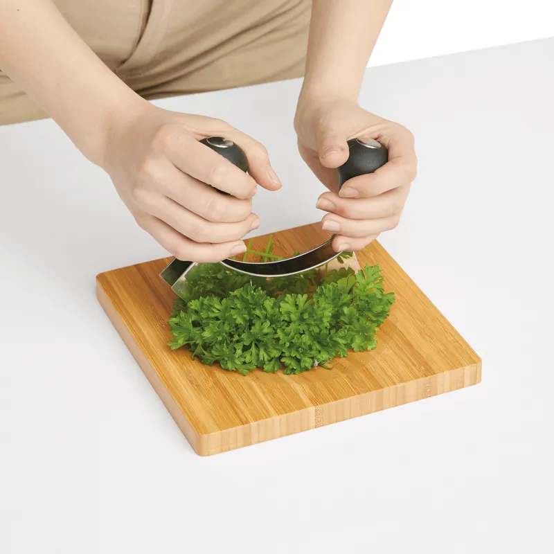 BUNCH Fűszernövény-aprító szett: tartalmaz egy dupla pengéjű félköríves kést (mezzaluna) és egy mélyedéssel ellátott bambusz vágódeszkát