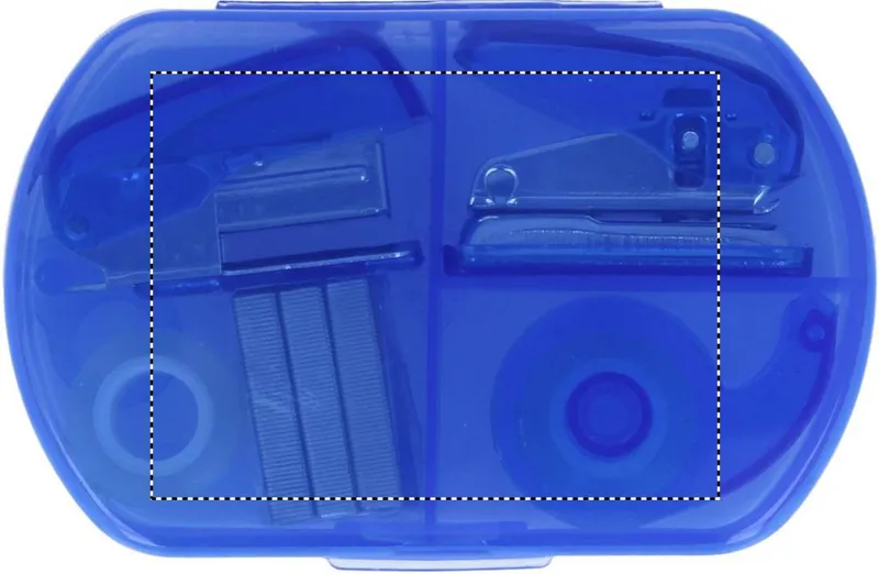 Irodai szett a legfontosabb irodai eszközökkel: cellux, celluxtépő, tűzőgép, 300 db pótkapocs, lyukasztó. Kemény műanyag tokban.