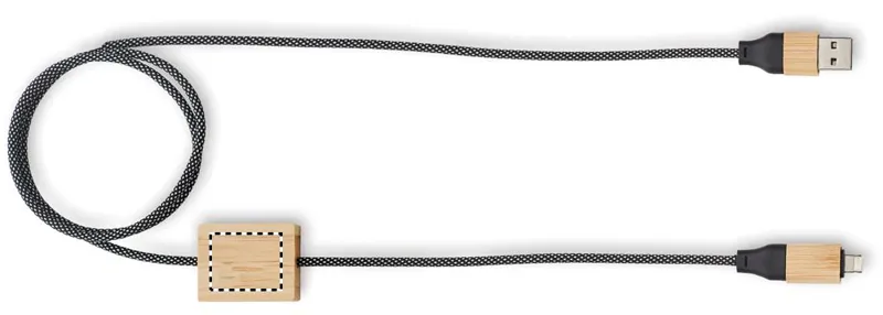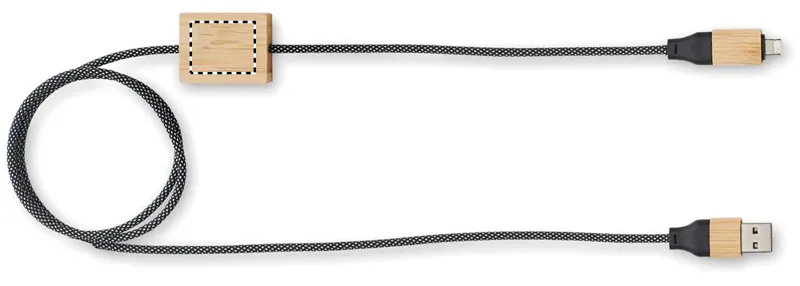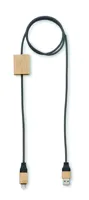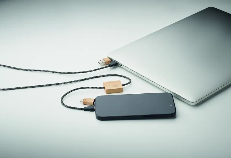 60W-os töltőkábel RPET-ből, bambusz részletekkel. Bemenet: 2 az 1-ben C-típusú és USB-A. Kimenet: C-típusú és 2 az 1-ben tűs.