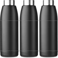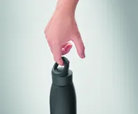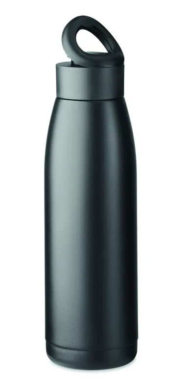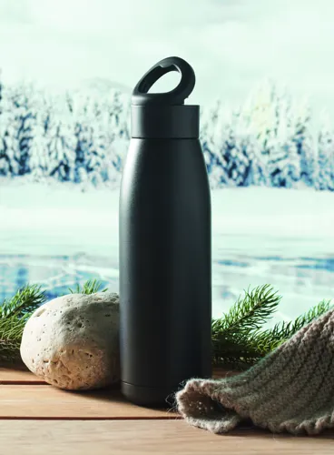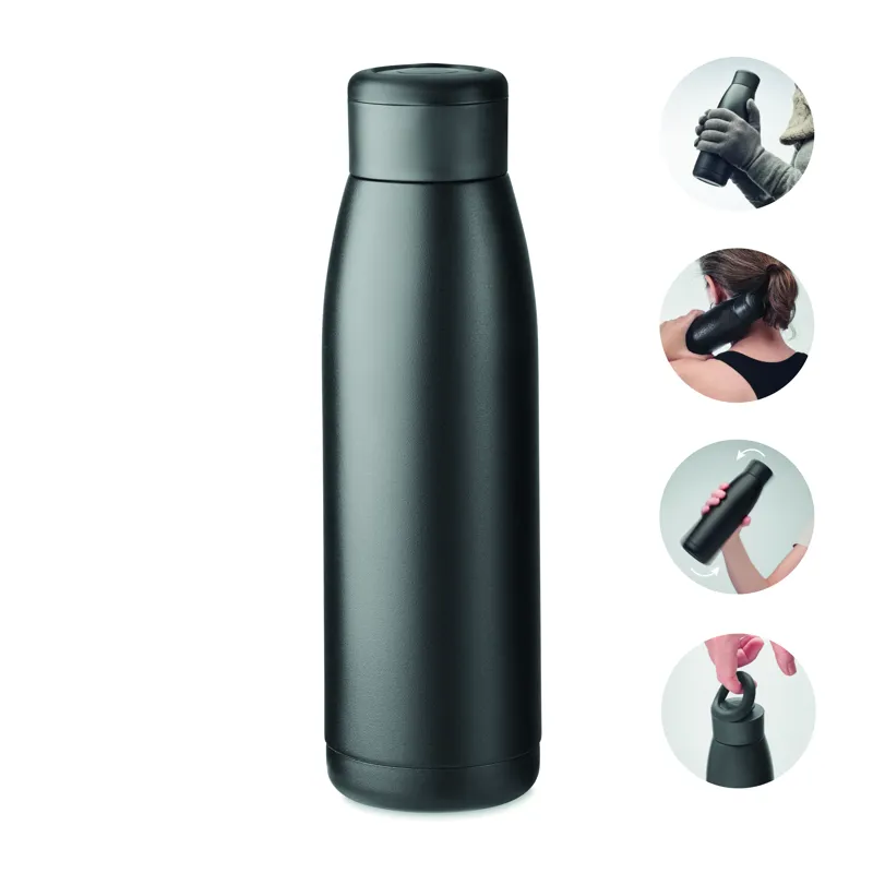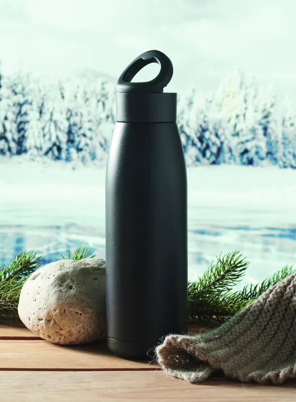 Duplafalú, újrahasznosított rozsdamentes acél palack (90% újrahasznosított- és 10% rozsdamentes acél), puha szilikon hordozógyűrűs fedéllel. A palack felületének hőmérséklete a benne lévő folyadék hőmérsékletétől függően változik, ha megrázzuk. Szivárgásmentes. 400 ml.
