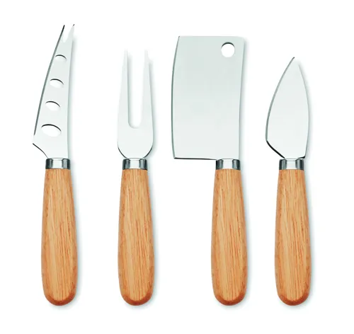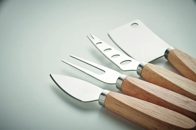 3 sajtkésből és 1 villából álló készlet rozsdamentes acélból, gumifa nyéllel.