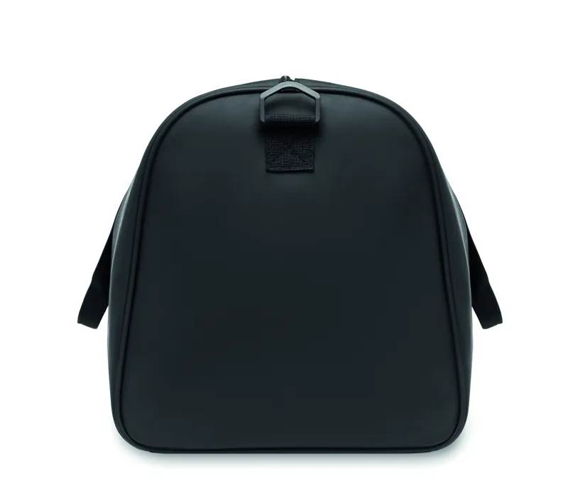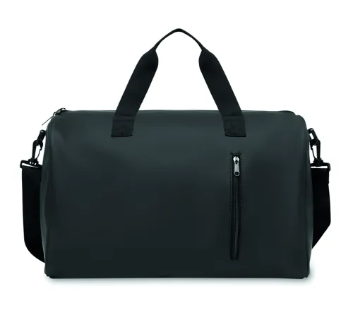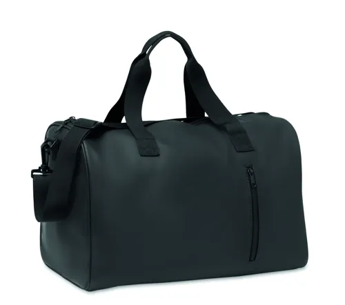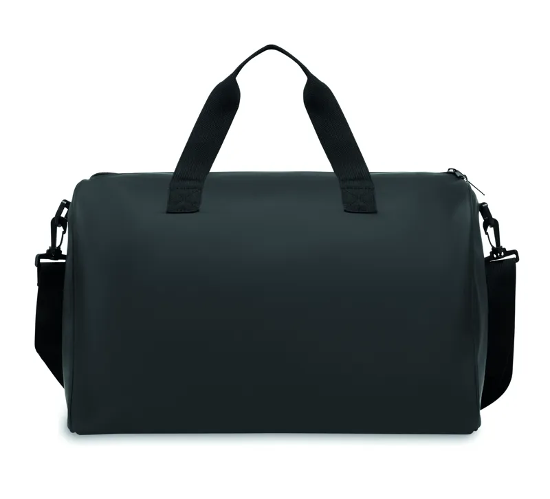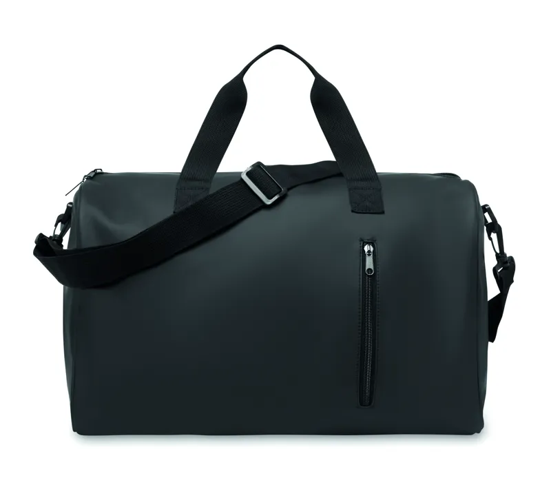 Sport- vagy utazótáska puha PU anyagból, alsó habszivacs megerősítéssel. Egy fő rekesz, cipzáras elülső zseb. 210D RPET poliészter bélés. 2 hordfül, állítható és levehető vállpánt.