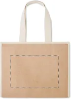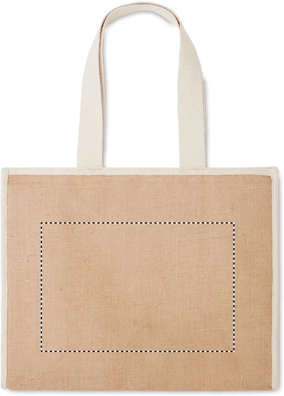Ez a juta bevásárló táska hosszú fülekkel, tépőzáras záródással, a belső oldalán pedig az élelmiszerek frissességének megőrzése érdekében hőszigetelő fólia réteggel rendelkezik. Az elülső részen széles, tépőzáras vászonzseb található a kisebb tárgyak számára. Ez a juta táska tökéletes a napi bevásárláshoz. Hosszú élettartammal rendelkezik, ami kiváló alternatívát jelent az eldobható, műanyag zacskókkal szemben.